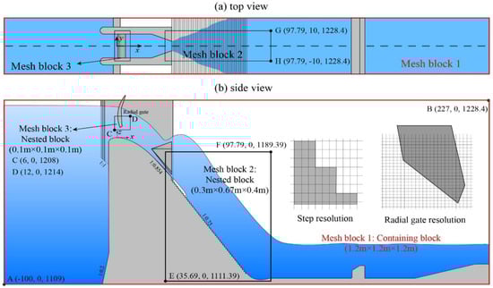 At the upstream and downstream boundaries, hydrostatic pressure boundaries based on the specified water elevation were set. At the top boundary, atmospheric pressure was specified. The left, right, and bottom boundaries were set as a solid non-slip wall. The standard wall function was used as commonly done in single-phase simulation, which implicitly indicates that the air phase effect on the near-wall flow characteristics was neglected. This is acceptable since the mesh Reynolds numbers adjacent to the step surface were as high as 1.7 × 106 to 3 × 106 (calculated by the velocity varying between 10 and 15m/s and mesh scale at 0.17 to 0.2 m) and therefore the air phase effect only occurs within a very small region near the wall and has an insignificant effect on the main flow. Three mesh blocks were used, namely a containing mesh block and two nested blocks, as shown in Figure 5. Two nested mesh blocks were arranged for the steps and the radial gate to resolve the geometry in the model. The size of the containing block (mesh block 1) was 1.2 × 1.2 × 1.2 m, and the size of the nested mesh blocks 2 and 3 were 0.3 × 0.67 × 0.4 m and 0.1 × 0.1 × 0.1 m, respectively, with respect to the x-y-z coordinate system, as shown in Figure 5.
