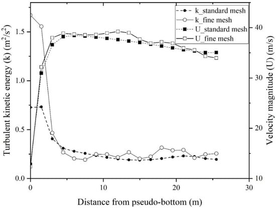 A mesh sensitivity analysis was carried out for mesh block 2 by using a finer mesh of 0.15 × 0.33 × 0.2 m, i.e., for half the values of the standard cell size. For the finer mesh, only 3% of the discharge difference was found and an identical cavity length (expressed by the number of steps it covered) was obtained. The velocity magnitude (U) and turbulent kinetic energy (k) profiles perpendicular to the pseudo-bottom at the 30th step are presented in Figure 6 for the two meshes, showing only small differences. The larger differences of the near-wall k values result from the FAVOR treatment and wall functions, affecting a flow depth up to about 3 m from the pseudo-bottom, while the effect on the main flow is insignificant. Consequently, the standard mesh was selected for the further simulations due to a significantly less computational cost at high velocity (roughly 40 m/s) two-phase flow.