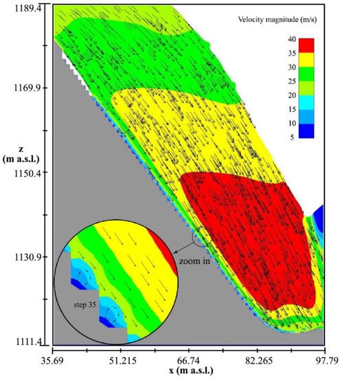 The velocity distribution at the axial longitudinal section is shown in Figure 9, where the main flow is approximately parallel to the steps, with a velocity magnitude of some 40 m/s. It can be seen in the enlarged picture (35th to 36th steps) in Figure 9 that in the step niches, the flow velocity is roughly 5 to 20 m/s, and above the pseudo-bottom, the velocity increases rapidly from 20 to 35 m/s within a distance of approximately three step heights. The step surface velocity is about 10 to 15 m/s without much variation, indicating that the pressure plays a more important role in affecting the cavitation index values and thus the cavitation potential.
