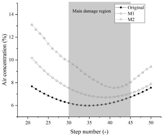 Figure 13 shows the air concentration distribution at the axial longitudinal section for the original design and the optimized structures M1 and M2. In addition, the air concentrations from the numerical simulations at the axial longitudinal section along the steps for the three above-mentioned designs are shown in Figure 14. It can be seen from Figure 13 that the cavity lengths in M1 and M2 were increased by one step. Consequently, with a higher first step and larger cavity, the step surface air concentration value increases significantly, especially at the upstream region above the 35th step. The lowest air concentration was increased from the original value of 6.1% to 6.7% and 7.7% for M1 and M2, respectively. The results show that heightening the first step is an efficient way for entraining more air and maintaining more air on the stepped surface.