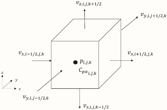 With the definitions of the pressure and velocities in Figure 1, the finite difference approximations of Equations (1) and (2) in the 3D Cartesian coordinates system are given as: