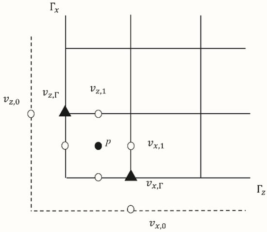 where , , , and are unknown vectors, and all of them go through the indices , , in the same order. and are the submatrices resulting from the terms of and in the Equation (8), respectively. and are the submatrices resulting from the terms of and in the Equation (9), respectively. and are the submatrices resulting from the terms of and in the Equation (10), respectively. , , and are the submatrices resulting from the terms of , , and in the Equation (11), respectively. , , , and are the right-hand side vectors resulting from the defined boundary conditions.