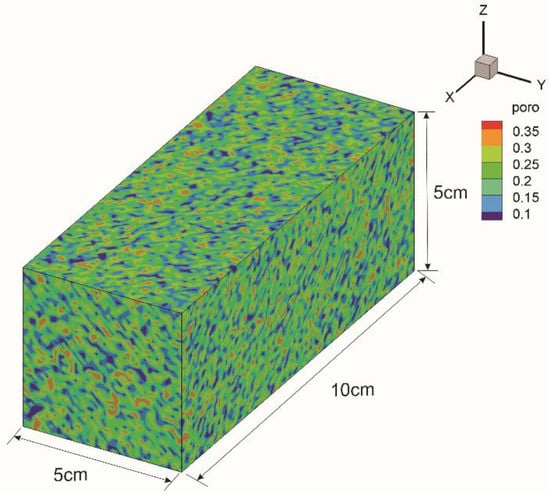 The dimension of the core sample and the initial porosity distribution with fluctuation in the interval [−0.15, 0.15].
