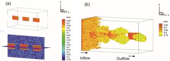 - Firstly, the Stokes–Brinkman equation (Equation (1)) and the continuity equation (Equation (2)) are solved by a staggered grid finite difference method for velocities and pressure.