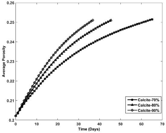 In this section, the mineral volume fractions are initially set to 80% calcite, 15% quartz, and 5% clay, and 70% calcite, 25% quartz, and 5% clay, respectively. The fluctuations are fixed in the interval , and the corresponding magnitude of heterogeneity is 0.75. Other initial and boundary conditions are the same among these three scenarios. The changes in average porosity are compared to investigate the effects of the mineral composition on the alterations of rock properties (Figure 8). Figure 8 illustrates a comparison of the average porosity of the fracture porous media from the beginning to the breakthrough among these three scenarios. The calcite has the highest chemical reactivity with the hydrogen ion among calcite, quartz, and clay, which consequently cause the highest chemical reaction rate. Therefore, an increased volume fraction of calcite at the beginning can lead to an expanded volume of dissolved calcite and can augment the mineral dissolution rate. As a result, a larger average porosity and an earlier breakthrough can be obtained, as shown in Figure 8.