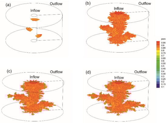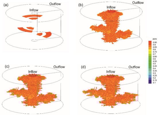 Figure 10 and Figure 11 represent the porosity profiles at different times with 3 and 6 originally disconnected fractures under the radial flooding condition, respectively. During the flooding process, the injected acid fluid flows preferentially through the fractures due to the good fluid conductivity. Chemical reactions which occur at the mineral surface under the action of the acidic fluid then leads to the dissolution of the mineral rock. As a consequence, the conductive pathways are formed nearby the initial fractures (Figure 10b–d and Figure 11b–d). Comparing Figure 10 and Figure 11, the more initially disconnected fractures are embedded into the porous media, the greater the number of ramified structures will be, and the formation of conductive pathways will be obtained more quickly.