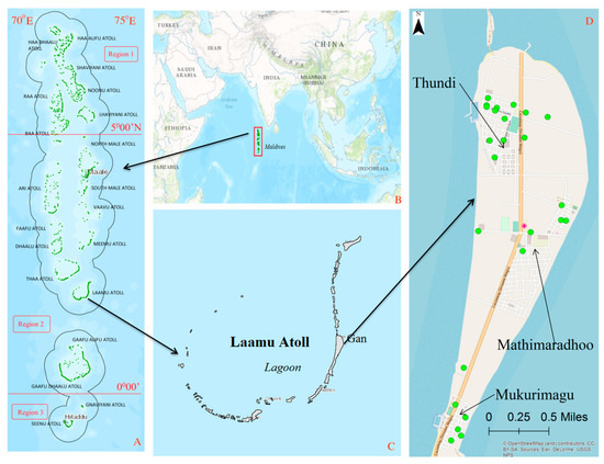 Map of the Republic of Maldives (A), located in Indian Ocean (B), with the Laamu atoll (C) and Gan Island (D) shown on the inset figures. Gan Island has a surface area of about 598 ha and a population of 4280 located within three main villages: Thundi, Mathimardhoo, and Mukurimagu. The green dots in the Gan Island inset figure show the location of the monitoring wells used to measure groundwater level and groundwater salinity concentration.