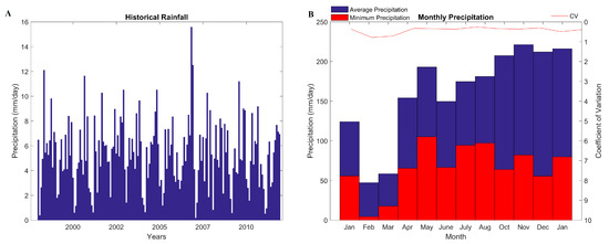 Historical monthly rainfall during 1998–2011 (A) and the average and minimum precipitation of each month during 1998–2011 (B).