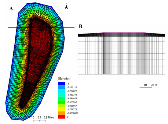 (A) Top view of the finite element mesh used for the SUTRA model of Gan Island, with colors indicating elevation (m) above sea level. The red elements indicate the surface area of the island, with the remaining elements depicting the shallow coastal areas of the island. (B) Cross section view of the mesh for the black line transect shown in Figure 3A, showing the vertical discretization of the elements to represent the aquifer.