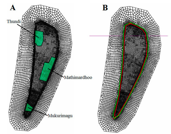 Finite element mesh used for the SUTRA model of Gan Island, showing (A) the collection of finite element nodes within each island village, and (B) the comparison of the island surface before (2012: green line) and after (2050: red line) sea level rise. The difference between the green and red lines indicates the island surface area that will be inundated by 2050.