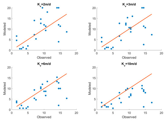 Observed vs. simulated lens thickness at the monitoring well locations shown in Figure 1, for four values of vertical hydraulic conductivity (Kv), with the red 1:1 line indicating a perfect match. Note that a small change in Kv results in significant changes in lens thickness.
