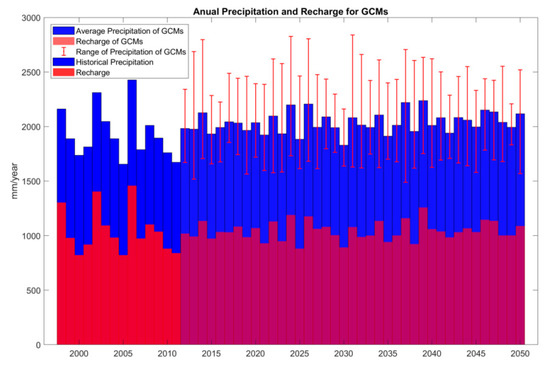 In the second step, the monthly rainfall depths from the selected GCMs are downscaled to daily rainfall data depths (mm) based on patterns in the historical daily rainfall data (1998–2011). Daily wet/dry sequences were generated using a Markov chain for historical data and fit into Gamma distribution for classification (wet/dry) and estimate daily rainfall for future wet days from GCMs [29]. Daily recharge depths (mm) are calculated from the downscaled data using the soil water balance model of [39]. The soil water balance model also includes the effect of GCM-estimated temperature on ET rates. The average daily rainfall depth during the simulation period is 5.58 mm/day, and the calculated recharge is 2.84 mm/day. More details regarding the downscaling methodology are provided in [29]. Time series of predicted rainfall data for 2012–2050 and their recharge rates are plotted in Figure 6. Error bars are included to indicate the spread of values from the GCMs.