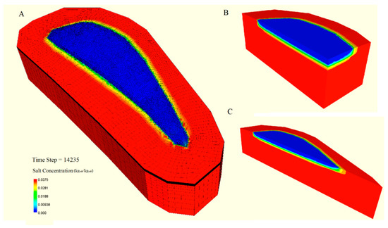Three-dimensional view of the SUTRA finite element mesh for Gan Island for year 2050, showing the spatial distribution of salt concentration in the aquifer. Red represents the salinity concentration of seawater, and blue represents freshwater (i.e., salinity concentration = 0), with other colors representing the transition zone. (A) shows the horizontal extent of the freshwater lens on the island, and (B,C) show cross sections of the freshwater lens through the longitudinal and transverse lines of the island.
