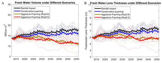 For Figure 8, results are shown for the set of simulations that use GCM weather data, and the average for each scenario is shown with a bolded line. For S5 (combined rainfall and aggressive pumping), results are shown for both the RCP2.6 and RCP8.5 climate scenarios. For S1 (rainfall only; black line), the volume of fresh groundwater increased by 20% (1.4 M to 1.67 M liters) by 2050, and the lens thickness increased by around 20% (6 to 7.25 m). These results are also summarized in Table 1. Fluctuation of volume and lens thickness is due to annual wet and dry seasons. For S2 (conservative pumping only; Figure 9A), the volume and lens thickness decreased by 8 and 7%, respectively, whereas S3 (aggressive pumping only; Figure 9B) results in a decrease in volume and lens thickness by 44 and 27%, respectively. However, if rainfall changes are combined with conservative pumping (S4) (Figure 8A), then there is an increase in volume and lens thickness through 2050 by 12 and 13%, respectively. If aggressive pumping is assumed (S5), then there is a decline in groundwater supply, with volume and average lens thickness decreasing by 24 and 7%. The decrease in lens thickness is smaller than that of the volume because the lens is averaged over the freshwater area after the shrink. As expected, lens volume for Gan Island in the coming decades is predicted to be less than that reported by a recent modeling study [30], due to the inclusion of population growth and the associated increased groundwater pumping.