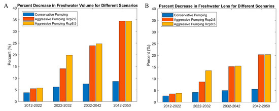 Percentage decrease in (A) freshwater lens volume and (B) freshwater lens thickness for each decade of simulation, as compared to the 2012 values for Scenarios 2 and 3 (conservative and aggressive pumping, respectively). These scenarios do not include the influence of future rainfall patterns. Scenario 3 includes both the RCP2.6 and RCP8.5 climate scenarios.