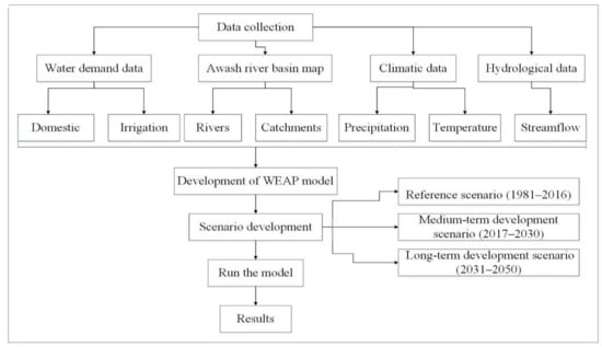 It also calibrates and validates the streamflow in four gauging stations (Akaki, Hombole, Melka Kuntre, and Modjo) in the Awash River Basin. Three scenarios were established after developing the WEAP model to predict the water demands until 2050. The model was run on a monthly basis. The baseline or current scenario 1980–2016 was set to estimate the irrigation water demand. The WEAP model for the Awash River Basin was set up to simulate the current/base year (1980) condition and three subsequent scenarios: the reference scenario (1981–2016), the medium-term development (2017–2030), and the long-term development (2031–2050). For each development scenario, the outputs analyzed include the water demand satisfaction of the irrigation demanding sector and spatiotemporal variations in water shortage. The methodology of the study is shown in (Figure 2).