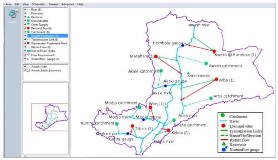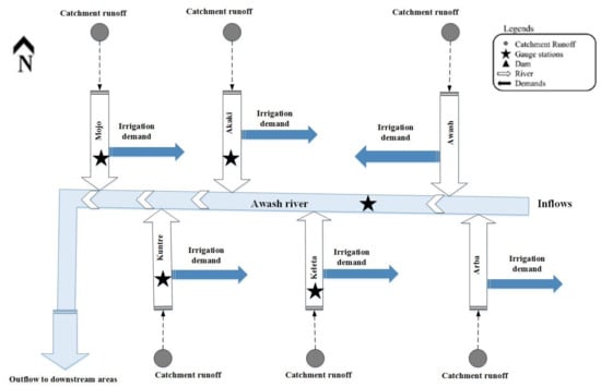 The Awash River Basin is the most utilized basin in Ethiopia. It covers a total area of 114,123 km2 that encompasses five regional states; Amhara, Oromia, Afar, SNNP, and Somali including two administrative councils, Addis Ababa and Dire Dawa []. The mean annual rainfall of the basin ranges from 100 to 1700 mm with great spatiotemporal variation. The basin also has a potential of 8.2 BCM and 10.3 BCM surface and groundwater, respectively, with 300 m exploration []. The temporal variation shares 71% and 29% of the rainy season (June to October) and dry season (November to May) respectively. The Awash River is the biggest contributor of water for the Awash River Basin. The river basin water is becoming scarce due to increasing demands and poor water resources management []. Hence, there is a need to allocate the water among the demanding sectors and to build water storage systems such as water harvesting, reservoirs, and dams. Water resources management models play a great role in addressing the water shortage of river basins by formulating prior allocation of water rights [,,].