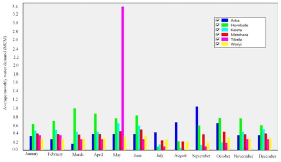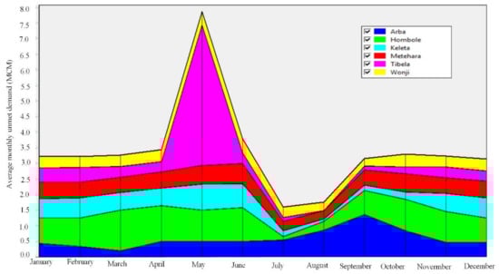 The total quantity of water needed to meet the irrigation demands of all the selected stations was 306.96 MCM from 1980 to 2016 under the current scenario. Seasonally, March, April, May, and June require the maximum irrigation water demand. However, July, August, and September require the minimum demand for water because of the Kiremt (wet) season. The extremely high unmet demand for water in May for the Tibela site was observed. This is probably due to a shortage of rainfall in Tibela since May is characterized as a dry month in the area. The average monthly supply of water delivered for each station are illustrated in Figure 5 without including the losses.
