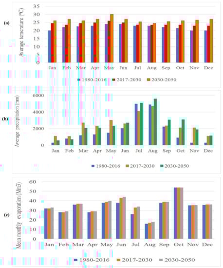 As far as the trends of evaporation in the reservoir are concerned, the modeled results showed decreasing and increasing trends in some months. The maximum and minimum evaporation was observed as 53.8 and 16.5 Mm3 in October and August, respectively. The evaporation under each scenario was also 33.73, 35.21, and 35.71 Mm3 in the 1980–2016, 2017–2030, and 2030–2050 scenarios, respectively. The simulation results of annual evaporation in each scenario was 404.80, 422.50, and 428.50 Mm3, respectively. The increase of evaporation in the reservoir was due to the increase of temperature under the climate change scenario. The climate change scenario with respect to temperature, precipitation, and evaporation is shown in (Figure 6).