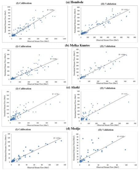 The WEAP model was calibrated and validated with monthly observed streamflow from 1980–1999 and 2000–2014, respectively (Figure 7). In order to simulate the streamflow values in the model, the crop coefficient of (kc) of different land covers, soil water capacity, root zone conductivity, and preferred flow direction were manually calibrated using the default values of the WEAP model (Table 4). Hence, during the calibration period of this study, the values of the coefficient of determination (R2) ranged from 0.73 to 0.91, with an average value of 0.82. On the other hand, the value of the Nash–Sutcliffe efficiency (NSE) was 0.65 and 0.83, the minimum and maximum values, respectively, with an average value of 0.74. However, during validation periods, 0.54 and 0.91 are the minimum and maximum values of the coefficient of determination (R2), with an average value of 0.73. As far as the values of the Nash–Sutcliffe efficiency (NSE), 0.50 and 0.84 were the minimum and maximum values respectively, with an average value of 0.67. From these values, we have observed that in both calibration and validation periods, the values correspond to a perfect match between the observed and the modeled streamflow values. Thus, the performance of the model is acceptable between the trends of observed and simulated streamflow in both calibration and validation of the study basin. This also helps to accurately project the prediction of future discharges based on the future scenario set. The statistical values of Akaki (R2 = 0.73; NSE = 0.65) were less than other gauging stations; Kuntre (R2 = 0.85; NSE = 0.73), Hombole (R2 = 0.89; NSE = 0.83), and Modjo (R2 = 0.91; NSE = 0.85) (Table 5). This may be due to urbanization.
