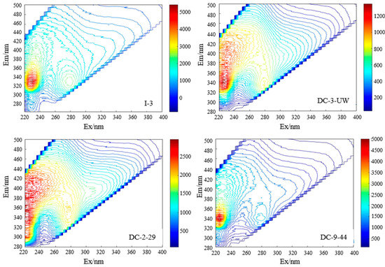 Examples of the fluorescence spectra of surface, underlying, and sediment pore waters collected from Dianchi Lake in different sampling points. I-3: third inlet river (Figure 1); DC-3-UW: underlying water of DC-3 site; DC-2-29: water from 29 cm in the sediment of DC-2; DC-9-44: water from 44 cm in the sediment of DC-9; Ex: excitation wavelength; Em: emission wavelength.
