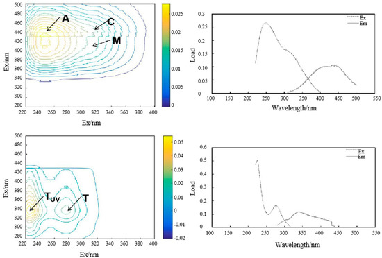 Fluorescent components in the water compartments of Dianchi Lake. On the left: spectral properties of DOM from the two sediments obtained by the parallel factor analysis (PARAFAC). Lines represent the loadings from the two-component model using the whole dataset. A: humic-like component in violet region; C: humic-like component in visible region; M: humic-like component related to microbial origination; T: protein-like component in visible region; Tuv: protein-like component in violet region; Ex: excitation wavelength; Em: emission wavelength; The blue-yellow column represents fluorescent intensity after PARAFAC calculation. Arrows point to the peak of components. On the left: changing load of DOM components along with increasing wavelengths after PARAFAC calculation.