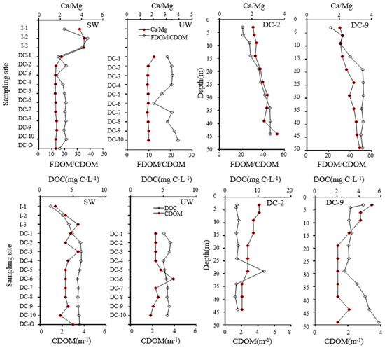 The variation trends of Ca/Mg and organic component (FDOM/CDOM) ratios in horizontal and vertical watercourses in Dianchi Lake. SW: surface water; UW: underlying water. For the sampling sites (I-1, I-2, I3, and DC1-10), see Figure 1. DOC: dissolved organic carbon; FDOM: fluorescent dissolved organic matter; CDOM: colored dissolved organic matter.