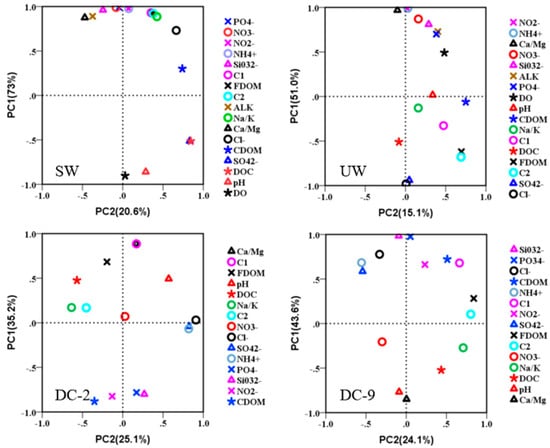 PC1 and PC2 loadings of DOM indices and environmental factors in surface (SW) and underlying (UW) pore waters at DC-2 and DC-9. PC1 and PC2 were obtained from principal component analysis. PC1: first primary component; PC2: second primary component.