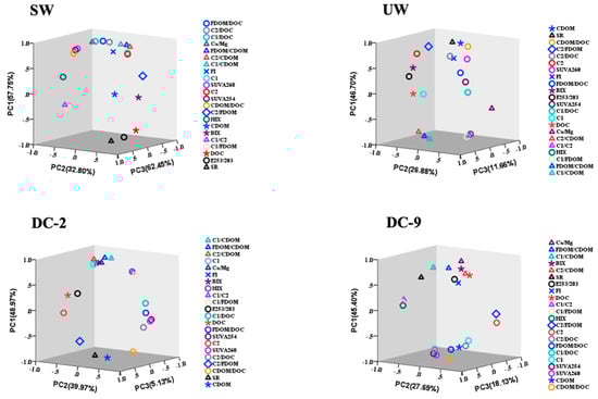 PC1, PC2, and PC3 loadings of optical indices and the relationship between organic components percentages and structures of DOM in surface (SW) and underlying (UW) water as well as pore water in sediments of DC-2 and DC-9. PC1, PC2, and PC3 were obtained from principal component analysis. PC1: first primary component; PC2: second primary component; PC3: third primary component.
