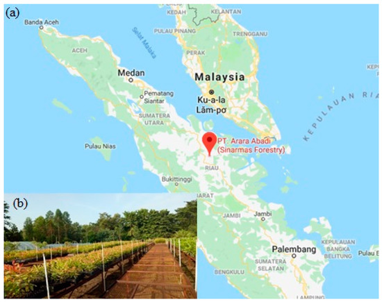 Location of the study site in Riau Province, Indonesia (a), and Eucalyptus pellita plants growing in open nursery beds (b).