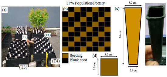 (a) Pottery pallets containing tubes of Eucalyptus pellita plants in treatments T1-T4, (b) layout of seedlings and blanks in treatment T1, and (c,d) side and top view of a tube and its dimensions.