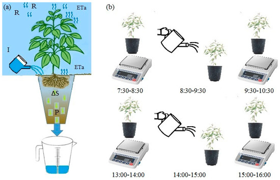 (a) Water balance components in lysimeter measurements of actual evapotranspiration (ETa), where R is rainfall, P is percolation, and I is irrigation, and (b) daily measurement and irrigation schedule in the experiment.
