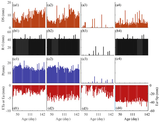 Water balance components in the different treatments (where 1–4 represent T1–T4, respectively) from 07:30 h to 16:00 h on day 40–142 of Eucalyptus pellita growth: (a1–a4) change in soil water storage (DS), (b1–b4) rainfall (R) plus irrigation (I), (c1–c4) percolation (P) and (d1–d4) evapotranspiration (ETa) or evaporation (Ea).