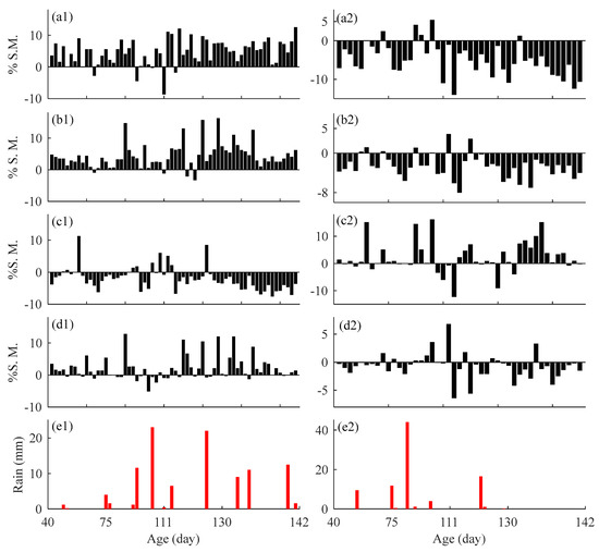 Soil moisture (SM) was measured during irrigation periods (DIP; 08:00 h-16:00 h) (Figure 5(a1–d1)) and outside irrigation periods (OIP; 16:00 h–08:00 h) (Figure 5a2–d2). The OIP soil moisture content decreased (showed negative values) in all treatments (T1–T4) except during rainfall events (Figure 5(a2–d2)). In the treatments where irrigation was applied (T1, T2 and T4), DIP increased accordingly (positive values), but some negative values were recorded (Figure 5(a1–d1)). These occurred when the decrease in soil moisture content in the afternoon between the two watering exceeded the increase in soil moisture after the second watering.