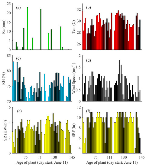 Meteorological data collected by an Automatic Weather Station at the study side during the project period. (a) Rainfall (Ra), (b) temperature (Tem), (c) relative humidity (RH), (d) wind speed, (e) solar radiation (SR), and (f) solar radiation period (SRP).