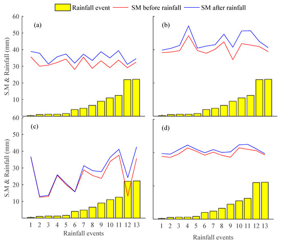 Effect of rainfall events on soil moisture (SM) content in (a–d) treatments T1-T4.