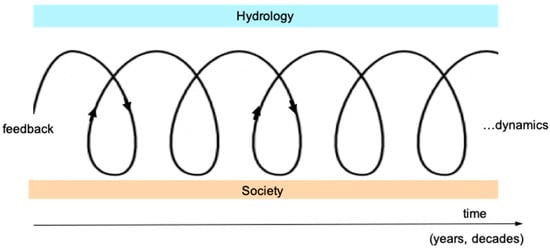 Authors’ interpretation of sociohydrology, adapted from Di Baldassare et al. [42]. The feedback loops represent the interplay between water and society. The relationship between water and society is external.