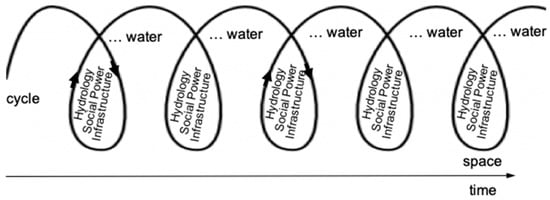 Authors’ interpretation of the hydrosocial cycle, adapted from Linton and Budds [27]. The series of loops reflects process of cyclic remaking of the hydrosocial cycle over time. The relationship between water and society is internal.