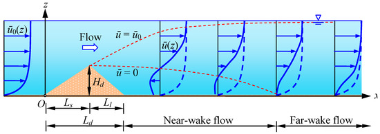 In a natural streamflow, an isolated dunal bedform acts as a bluff-body, producing wall-wake flow at its downstream. The wake flow downstream of an isolated dunal bedform persists up to a certain stretch until the local wake flow diffuses to and becomes the part of the undisturbed upstream flow. Figure 1 presents a conceptual representation of flow past an isolated dunal bedform in xz plane. Here, x is the streamwise distance measured from a convenient point O and z is the vertical distance from the bed. The dune length Ld comprises the stoss-side length Ls and the leeside length Ll (Ld = Ls + Ll). The dune height Hd is the vertical distance of the dune crest from the bed. Downstream of the dune, a flow reversal takes place, called the near-wake flow. Afterward, the flow is called the far-wake flow. In Figure 1, the lower dashed line denotes the locus of ū(z) = 0, whereas the upper dashed line signifies the boundary layer (ū = ū0) in the wall-wake flow. Here, ū(z) is the time-averaged streamwise flow velocity in the wake flow and ū0(z) is the time-averaged streamwise flow velocity in the undisturbed upstream flow. In the far downstream of the dunal bedform, the flow achieves the undisturbed upstream state, called the fully recovered open-channel flow.
