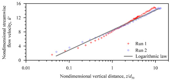 Figure 4. Vertical profiles of nondimensional streamwise flow velocity ū+ at the upstream of isolated dunal bedforms for Runs 1 and 2.