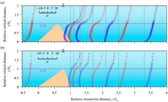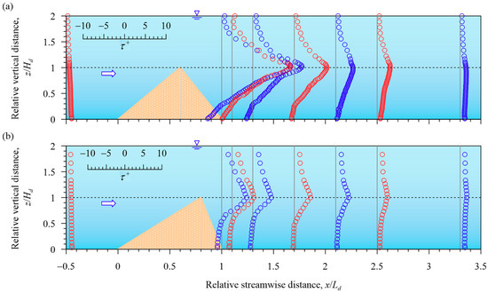Figure 5 shows the vertical profiles of nondimensional streamwise flow velocity ū+ at upstream and various downstream relative streamwise distances x/Ld in Runs 1 and 2. Immediate downstream of the dune (x/Ld = 1), the wall-shear flow separates from the dune crest, giving rise to a flow reversal owing to negative streamwise flow velocity. The near-wake flow zone extends up to x/Ld ≈ 1.7. As the flow reaches further downstream, the flow reversal disappears. In addition, the streamwise flow velocity, having a velocity defect, starts to recover the undisturbed upstream velocity profile in the far-wake zone (x/Ld = 2.1 to 2.5). At x/Ld ≈ 3.3, the velocity profile appears to follow the undisturbed upstream velocity profile. It is also evident that above the relative vertical distance z/Hd = 1.5, the values of ū+ remain almost the same irrespective of x/Ld. However, the extents of the near- and far-wake flow zones in Runs 1 and 2 are different because of the effects of dune dimensions. It is worth mentioning that in wall-wake flows downstream of a sphere and a horizontal cylinder, the velocity profiles appear to follow their corresponding undisturbed upstream velocity profile at streamwise distances equaling roughly 8.5 and 7 times the diameter of sphere and cylinder, respectively [12,21].