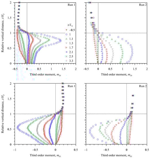 Figure 7. Vertical profiles of third-order moments m30 and m03 at various relative streamwise distances x/Ld in Runs 1 and 2.