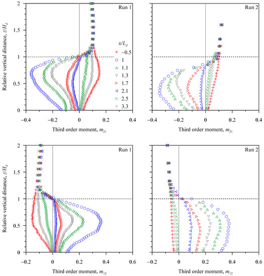 Figure 8. Vertical profiles of third-order moments m21 and m12 at various relative streamwise distances x/Ld in Runs 1 and 2.