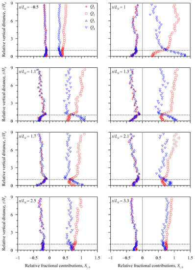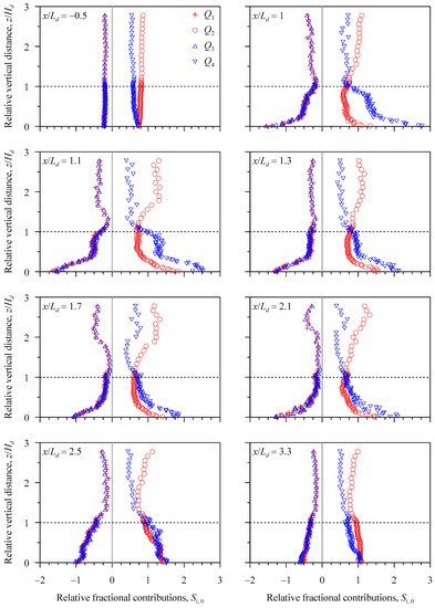 Figure 9 and Figure 10 show the vertical profiles of Si,0 at the upstream and various downstream relative streamwise distances x/Ld in Runs 1 and 2, respectively. Upstream of the dune (x/Ld = –0.5), the Q2 and Q4 events remain the most and the second-most contributing events, respectively, to the production of Reynolds shear stress. However, the Q1 and Q3 events are trivial across the flow depth. Downstream of the dune (x/Ld = 1 to 2.1), all the four events contribute largely below the dune crest with prevailing Q4 events in the form of arrival of high-speed fluid streaks. At x/Ld = 2.5, contributions from the Q2 and Q4 events appear to be nearly equal below the crest. Further downstream (x/Ld = 3.3), the Q2 events dominate over Q4 events in the form of arrival of low-speed fluid streaks. It may be noted that above the crest (z/Hd > 1), the Q2 events are the most contributing events regardless of x/Ld.