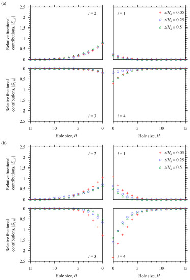 Figure 12. Relative fractional contributions |Si,H| as a function of hole size H in Run 1 at relative streamwise distances (a) x/Ld = 1.7 and (b) x/Ld = 3.3 for relative vertical distances z/Hd = 0.05, 0.25 and 0.5.