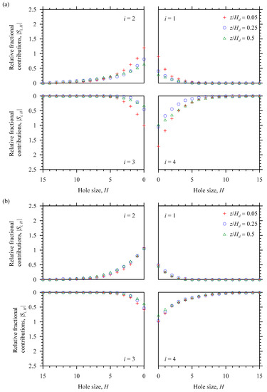 Figure 11. Relative fractional contributions |Si,H| as a function of hole size H in Run 1 at relative streamwise distances (a) x/Ld = –0.5 and (b) x/Ld = 1 for relative vertical distances z/Hd = 0.05, 0.25 and 0.5.