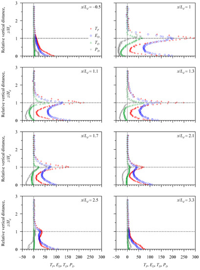 The turbulent kinetic energy budget reads tP = ε + tD + pDvD, where tP is the turbulent kinetic energy production rate (= – u w ¯ ū/∂z), ε is the turbulent kinetic energy dissipation rate, tD is the turbulent kinetic energy diffusion rate (= ∂fkw/∂z), fkw is the vertical flux of turbulent kinetic energy, pD is the pressure energy diffusion rate [= ρ−1∂( p w ¯ )/∂z], p′ is the pressure fluctuations, vD is the viscous diffusion rate (=ν2k/∂z2) and k is the turbulent kinetic energy. In an open channel flow, the vD is insignificant compared to other components of the turbulent kinetic energy budget. In this study, Kolmogorov second hypothesis was applied to determine the ε from the velocity power spectra [28]. The tP and tD were determined from the experimental data, whereas the pD was obtained from the relationship pD = tPεtD. In nondimensional form, the set of variables (tP, ε, tD, pD) is expressed as (TP, ED, TD, PD) = (tP, ε, tD, pD) × (Hd/ u * 3 ).