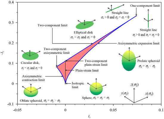 The Reynolds stress anisotropy tensor bij is expressed as bij = u i u j ¯ /(2k) − δij/3, where δij is the Kronecker delta function [δij(i = j) = 1 and δij(ij) = 0]. To ascertain the degree and the nature of anisotropy, the second and third principal invariants, I2 (= –bijbij/2) and I3 (= bijbjkbki/3), respectively, are introduced. The Reynolds stress anisotropy is determined by plotting –I2 as a function of I3, called the anisotropy invariant map (AIM). In an AIM, the possible turbulence states are confined to a triangle, called the Lumley triangle (Figure 14). The left-curved and the right-curved boundaries of the Lumley triangle, given by I3 = ±2(−I2/3)3/2, are symmetric about the plane-strain limit (I3 = 0). In addition, the top-linear boundary of the Lumley triangle obeys I3 = −(9I2 + 1)/27. Dey et al. [29] envisioned the Reynolds stress anisotropy from the perspective of the shape of ellipsoid formed by the Reynolds normal stresses (σx, σy, σz) in (x, y, z). In an isotropic turbulence (σx = σy = σz), the stress ellipsoid becomes a sphere (Figure 14). On the left-curved boundary, called the axisymmetric contraction limit, one component of Reynolds normal stress is smaller than the other two equal components (σx = σy > σz), forming the stress ellipsoid an oblate spheroid. On the left vertex, called the two-component axisymmetric limit, one component of Reynolds normal stress disappears (σx = σy and σz = 0) to make the stress ellipsoid a circular disc (Figure 14). On the right-curved boundary, called the axisymmetric expansion limit, one component of Reynolds normal stress is larger than the other two equal components (σx = σy < σz), making the stress ellipsoid a prolate spheroid (Figure 14). Further, on the top-linear boundary, called the two-component limit, one component of Reynolds normal stress is larger than the other component together with a third vanishing component (σx > σy and σz = 0), producing the stress ellipsoid an elliptical disk. The point of intersecting of the plain-strain limit and the two-component limit is called the two-component plain-strain limit. Moreover, on the right vertex of the Lumley triangle, called the one-component limit [(σx > 0, σy = σz = 0) or (σx = σy = 0, σz > 0)], only one component of Reynolds normal stress sustains to make the stress ellipsoid a straight line (Figure 14).