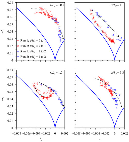 Figure 15 shows the data plots of −I2 versus I3, confined to the AIM boundaries, at various relative streamwise distances x/Ld in Runs 1 and 2. Upstream of the dune (x/Ld = −0.5), the data plots initiate from the near left vertex, moving toward the bottom cusp, and then, with an increase in vertical distance, they cross the plain-strain limit to shift toward the right-curved boundary. The trends of the data plots for both Runs 1 and 2 are almost monotonic. The AIM of the upstream indicates that as the vertical distance increases, the turbulence anisotropy tends to reduce to a quasi-three-dimensional isotropy. Immediate downstream of the dune, the data plots tend to create a stretched loop inclined to the left-curved boundary. However, below the dune crest (z/Hd < 1), the data plots in the near-bed flow zone initiate from the plain-strain limit and with an increase in vertical distance up to the crest, they shift toward the left vertex following the left-curved boundary. This suggests that the turbulence anisotropy has an affinity to a two-dimensional isotropy. Above the crest, the data plots turn toward the right and as the vertical distance increases further, they move toward the bottom cusp following the left-curved boundary. This demonstrates that the turbulence anisotropy tends to reduce to a quasi-three-dimensional isotropy. Further downstream (x/Ld = 1.7), the size of the loop created by the data plots reduces forming a tail, and the loop disappears at x/Ld = 3.3, signifying a recovery of the undisturbed upstream trend. It therefore appears that that below the crest, the turbulence has an affinity to a two-dimensional isotropy, whereas above the crest, a quasi-three-dimensional isotropy prevails.