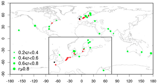 Validation of the centennial reanalysis steric sea level against long-record tide gauge stations: Green bullets are located where the stations exhibit statistically significant correlations (at 95% confidence level); red bullets when the stations show non-significant correlation but at least one ensemble member shows significant correlation; black bullet where neither the ensemble mean nor any individual reanalysis show significant correlation. The value of the correlation is indicated by the size of the green bullets, as in the legend. Zoom over north European coasts is shown in the bottom panel.